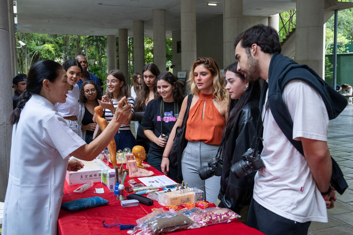 2025年4月15日,在巴西里約熱內(nèi)盧天主教大學(xué)舉辦的“國際中文日”慶?;顒由希瑢W(xué)生們觀看中醫(yī)療法展示。