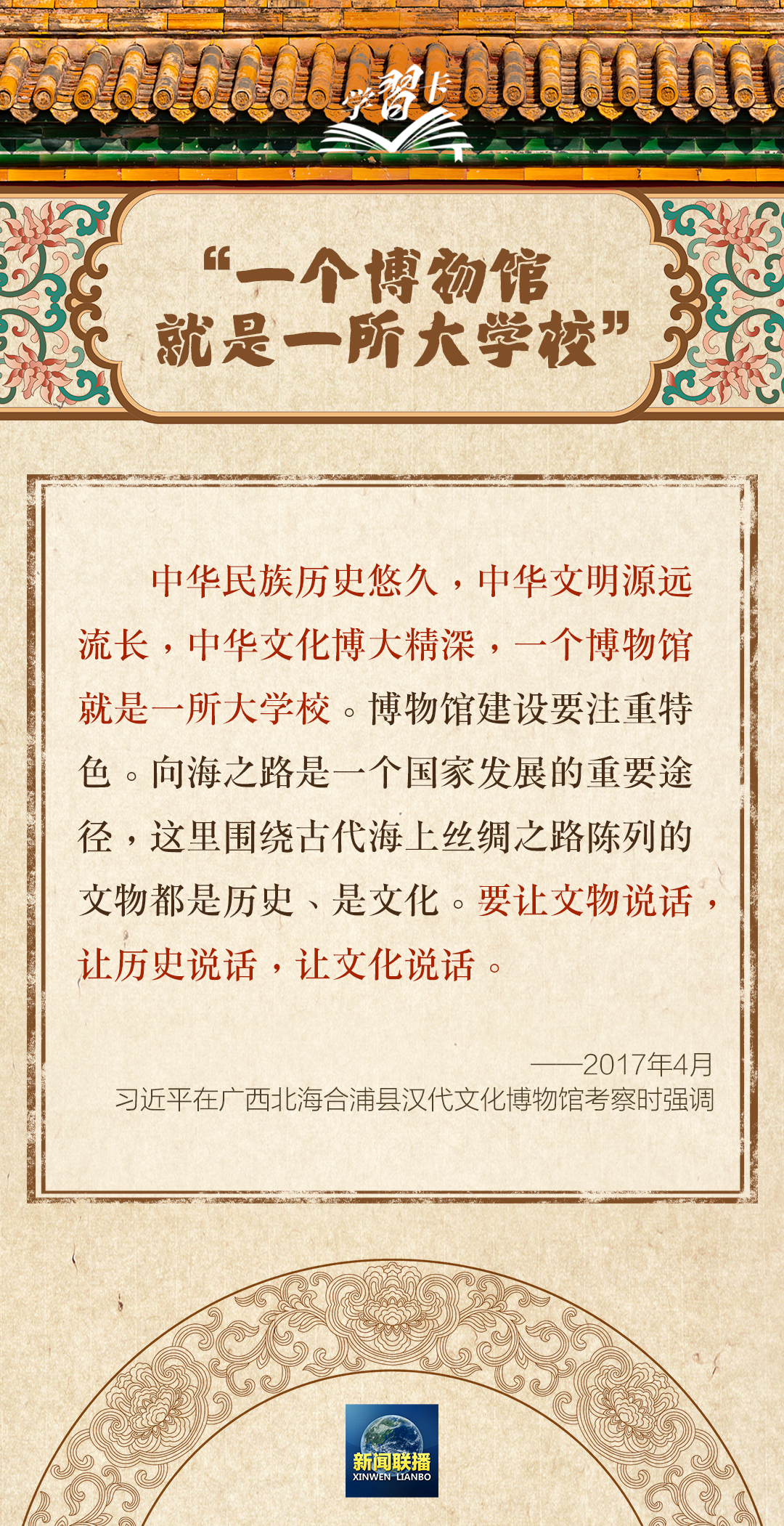 習(xí)近平總書(shū)記一直高度重視博物館工作,經(jīng)常“打卡”博物館,察看具有濃郁文化色彩的展品,對(duì)文物保護(hù)和文化傳承工作作出重要部署。