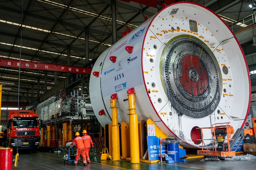 2022年11月23日,工人在中鐵裝備集團車間內(nèi)運輸掘進機零部件。新華社發(fā)