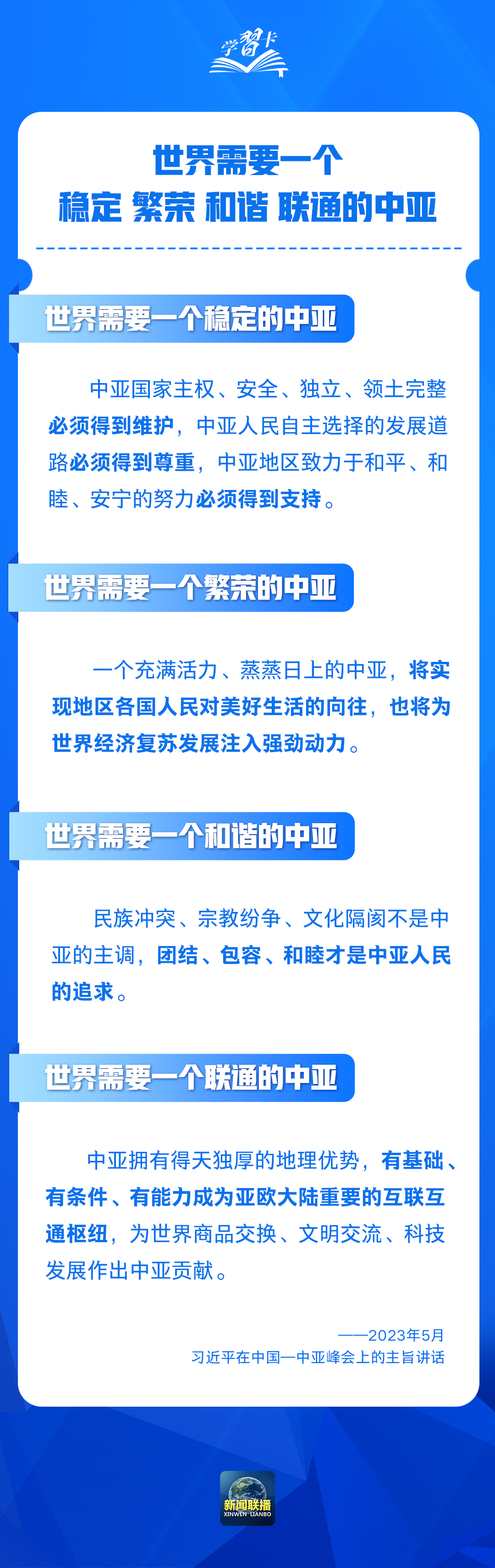 中亞是亞歐大陸的中心,處在聯(lián)通東西、貫穿南北的十字路口。習近平主席強調,深化中國—中亞合作,是我們這代領導人著眼未來作出的戰(zhàn)略抉擇,順應世界大勢,符合人民期盼。