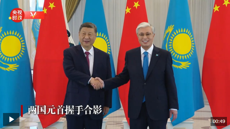 當(dāng)?shù)貢r間6月16日下午,國家主席習(xí)近平乘車抵達(dá)阿斯塔納總統(tǒng)府,托卡耶夫總統(tǒng)在下車處迎接。會談前,兩國元首握手合影。