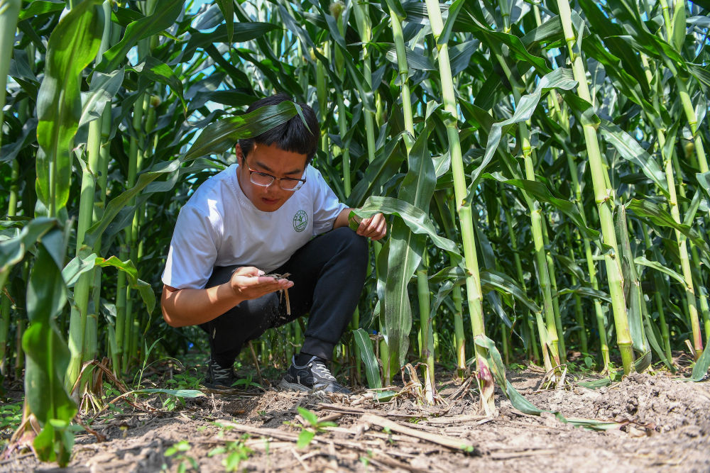 2023年7月31日,在位于吉林省四平市梨樹(shù)縣的中國(guó)農(nóng)業(yè)大學(xué)“科技小院”保護(hù)性耕作試驗(yàn)田,一名學(xué)生查看玉米根部在黑土中的生長(zhǎng)情況。