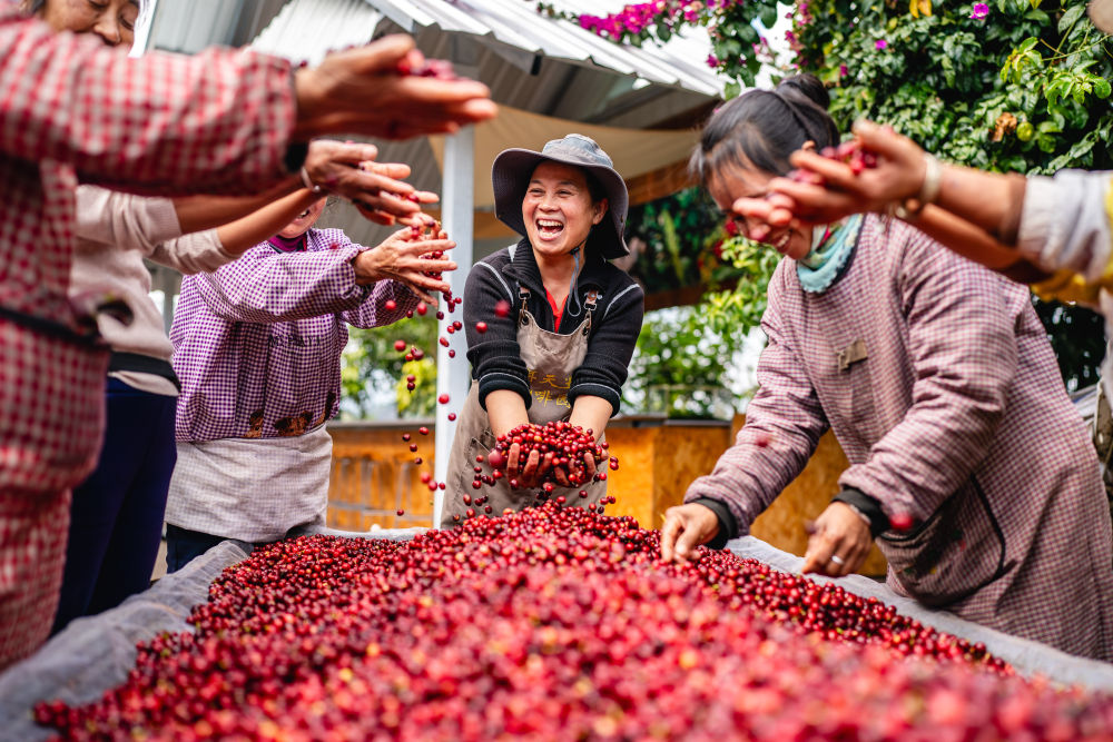 在云南省普洱市思茅區(qū)天玉咖啡莊園,莊園經(jīng)營者玉噸(中)和工作人員慶祝咖啡豐收(2025年1月8日攝)。新華社記者 胡超 攝