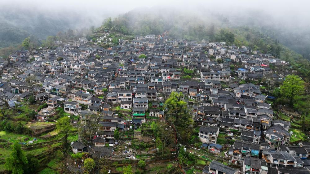 2025年3月30日,在廣東省清遠市連南瑤族自治縣三排鎮(zhèn)南崗村拍攝的云霧中的千年瑤寨。