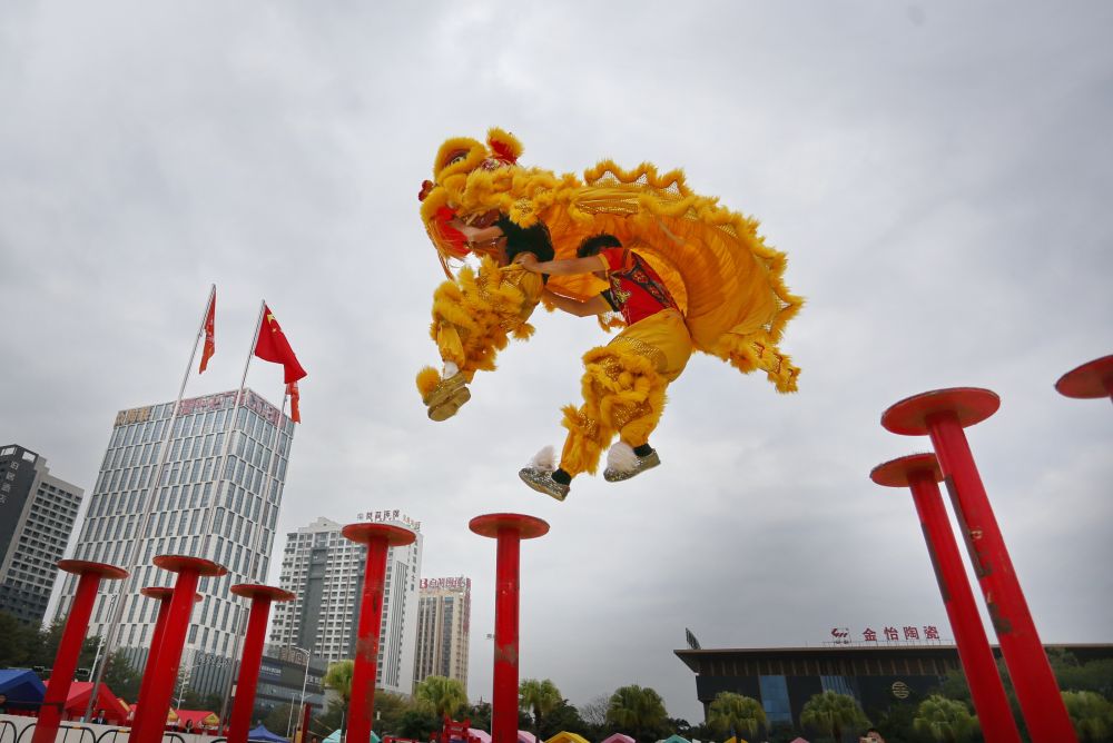 2025年1月22日,鶴山禧誠龍獅隊在廣東省佛山市禪城區(qū)南莊鎮(zhèn)進行梅花樁舞獅表演。