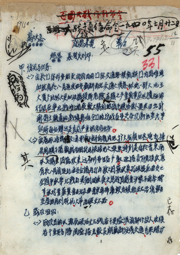 為粉碎侵華日軍的“囚籠政策”、遏制國民黨頑固派的妥協投降逆流,1940年8月至翌年1月,中國共產黨領導的八路軍在華北發(fā)動了百團大戰(zhàn)。百團大戰(zhàn)第一階段以破襲正太鐵路為重點,這是1940年7月22日簽發(fā)的破襲正太路戰(zhàn)役預備命令(中央檔案館提供)。