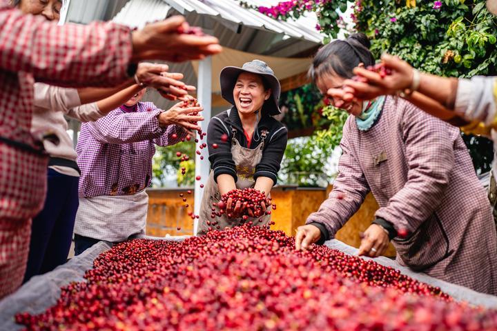 2025年1月8日,在云南省普洱市思茅區(qū)天玉咖啡莊園,工作人員慶祝今年咖啡豐收。目前,普洱市咖啡種植面積達(dá)67.9萬畝,2023到2024年產(chǎn)季咖啡生豆產(chǎn)量5.8萬噸,穩(wěn)居中國(guó)咖啡種植面積與產(chǎn)量之首。