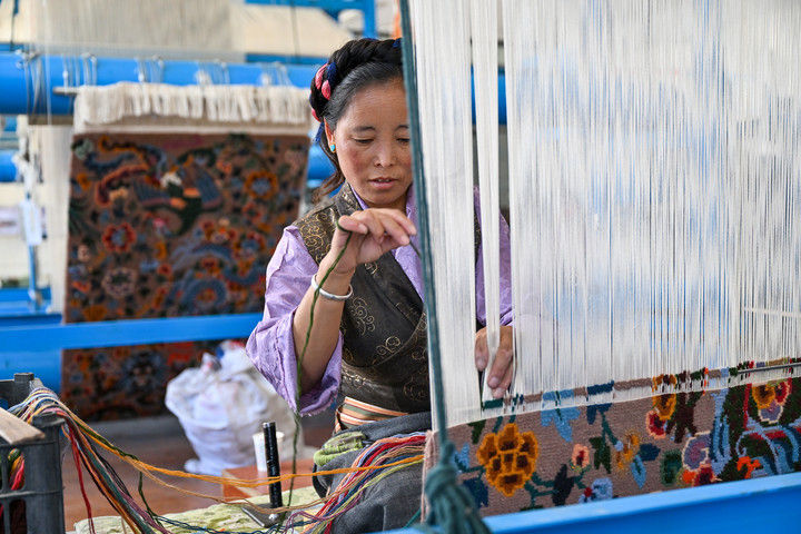 2025年7月18日,江孜藏毯文化發(fā)展有限責(zé)任公司的員工在生產(chǎn)車間內(nèi)編織藏毯。西藏日喀則市江孜縣是著名的藏毯(藏族稱為“卡墊”)之鄉(xiāng),織毯歷史悠久。藏族卡墊織造技藝于2006年被列入國(guó)家級(jí)非物質(zhì)文化遺產(chǎn)代表性項(xiàng)目名錄。近年來,江孜藏毯在守護(hù)傳統(tǒng)技藝的同時(shí)積極創(chuàng)新,通過建立合作社、開辦技能培訓(xùn)班等方式擴(kuò)大靈活就業(yè)規(guī)模,讓更多人在家門口織藏毯增收。