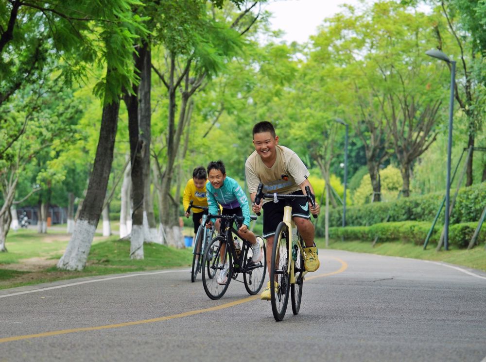 2025年8月5日,小朋友在四川成都錦城湖公園內(nèi)騎行。