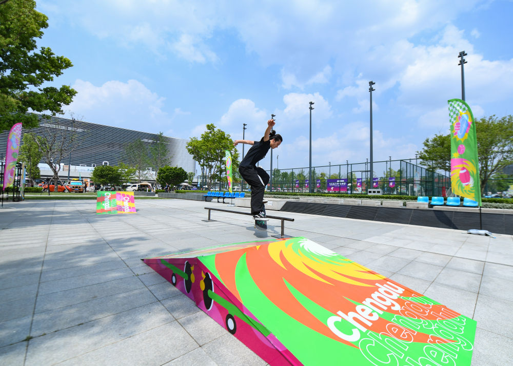 2023年4月19日,體育愛好者在四川成都東安湖體育公園練習(xí)滑板。