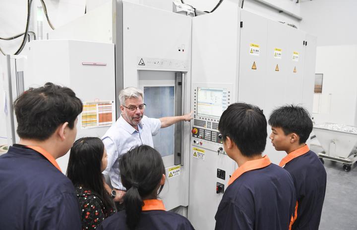 2024年4月16日,在位于重慶市永川區(qū)中德產(chǎn)業(yè)園的埃斯維(重慶)機床有限公司,公司技術(shù)總監(jiān)向重慶城市職業(yè)學(xué)院中德產(chǎn)業(yè)學(xué)院學(xué)生介紹設(shè)備操作規(guī)范。近年來,重慶城市職業(yè)學(xué)院聯(lián)合德國教育力量共建產(chǎn)業(yè)學(xué)院,引入職業(yè)教育先進經(jīng)驗,著力培養(yǎng)適合制造型企業(yè)需求的高素質(zhì)技能技術(shù)人才。