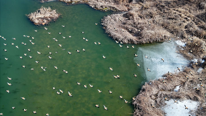 候鳥在黃河寧夏段一處濕地棲息、覓食(2025年2月26日攝,無人機(jī)照片)。