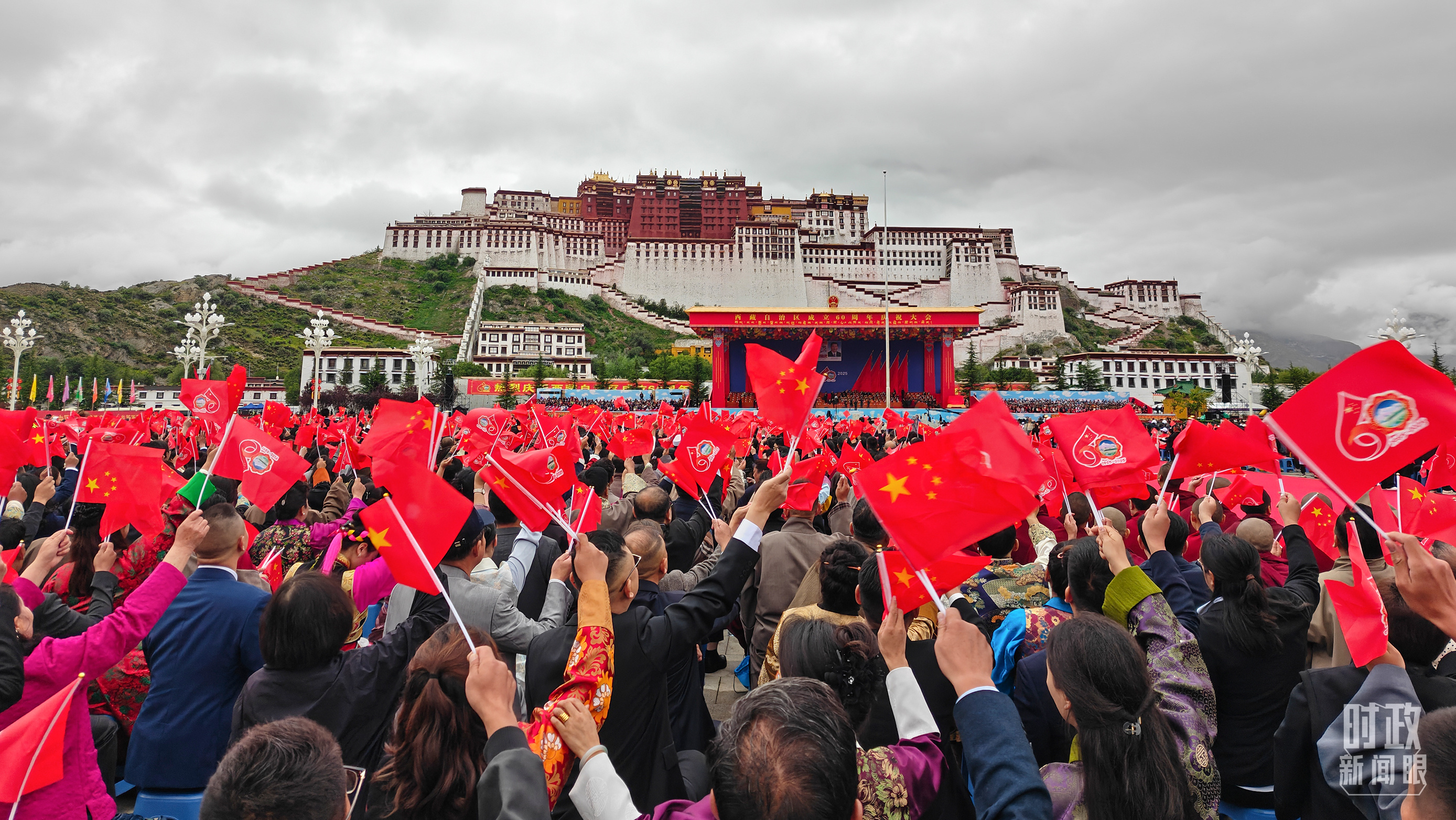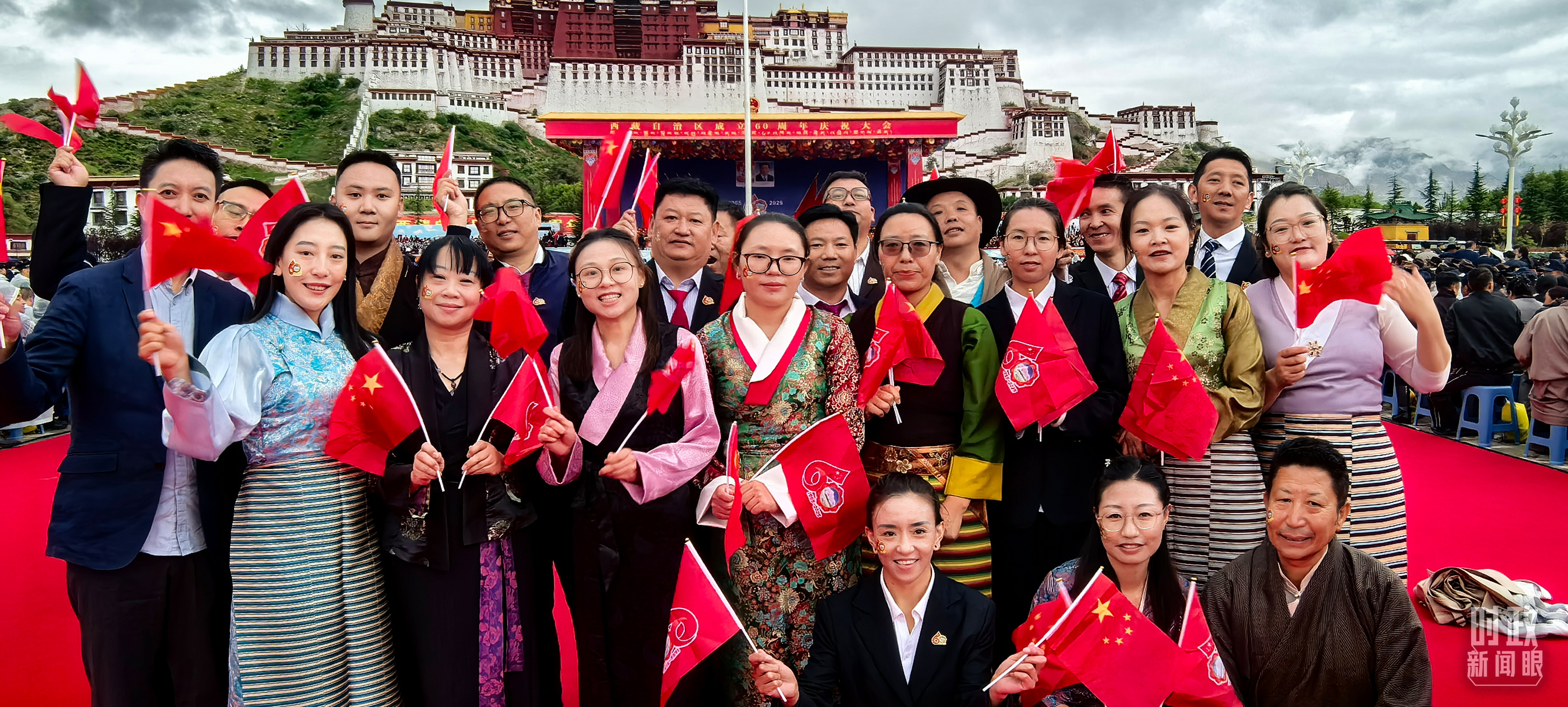 慶祝大會的會場設置在雄偉的布達拉宮前,位于群山環(huán)抱之中。大會主席臺采用藏式風格。約2萬人歡聚布達拉宮廣場,紅、黃、白、藍等體現(xiàn)藏族文化基因的色彩鋪滿眼前,烘托出吉祥喜慶的濃烈氛圍。