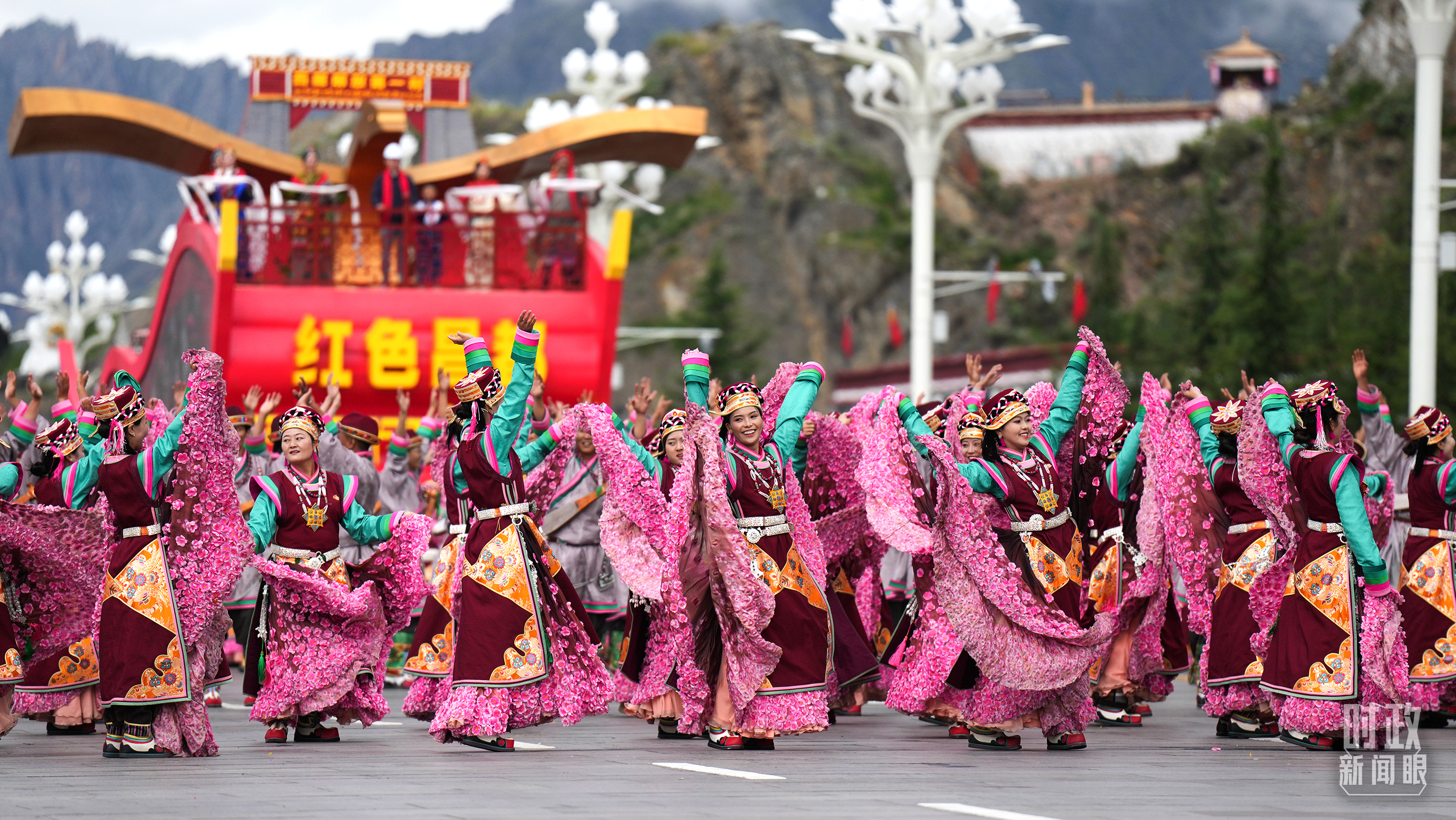 六十載櫛風沐雨,一甲子滄海桑田。格?;êH何柚校茡P的扎念琴聲響起,雄渾的甲諧舞、瓊結卓舞、弦子舞、鍋莊舞、普蘭宣舞應接不暇,舞出西藏繁榮發(fā)展的精氣神。身穿工布服飾、飛天服飾等藏族特有服飾的游行群眾,以一場非物質文化遺產(chǎn)的盛宴向西藏自治區(qū)成立60周年獻禮。