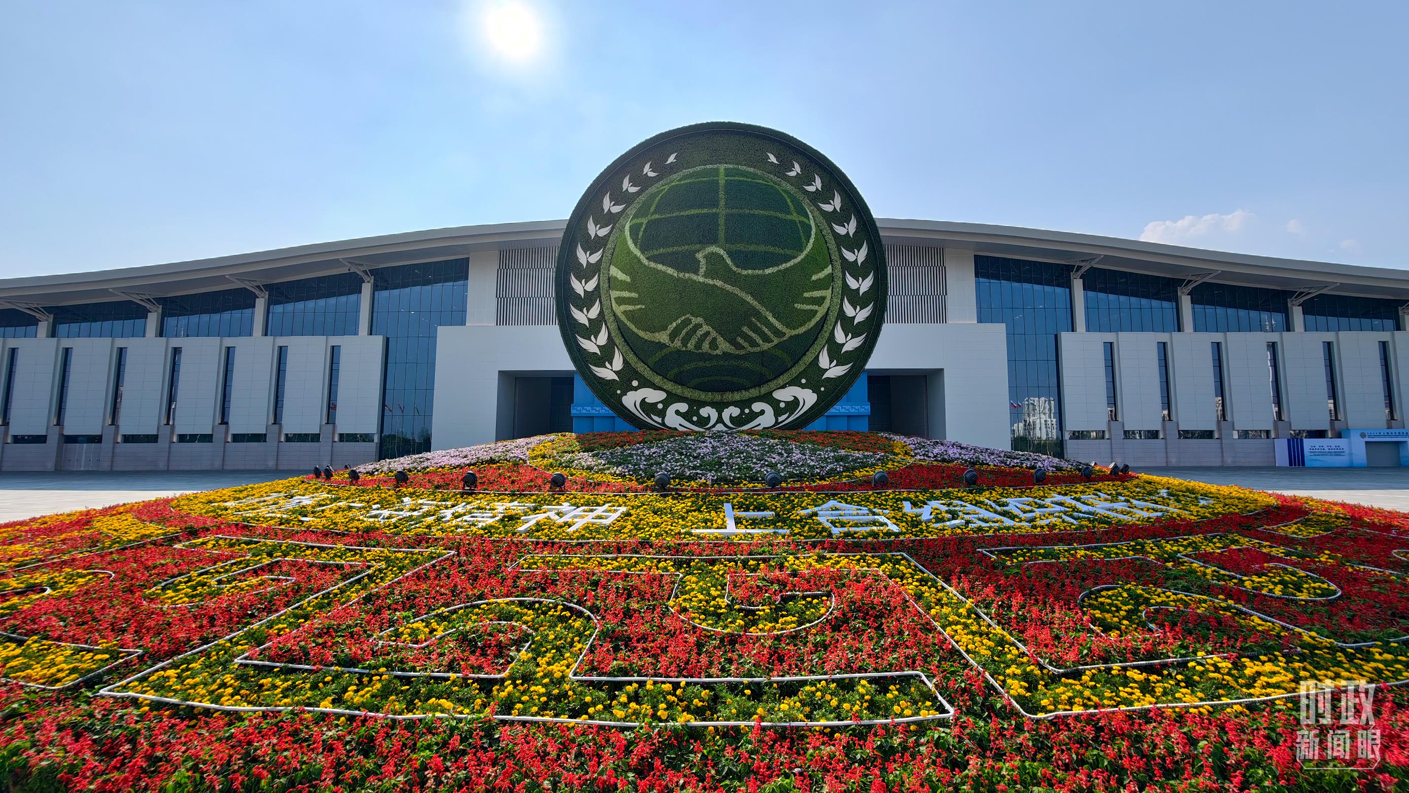 與會(huì)各國(guó)國(guó)旗、上合組織會(huì)旗和聯(lián)合國(guó)旗幟組成的恢弘旗陣。(總臺(tái)央視記者劉琦拍攝)