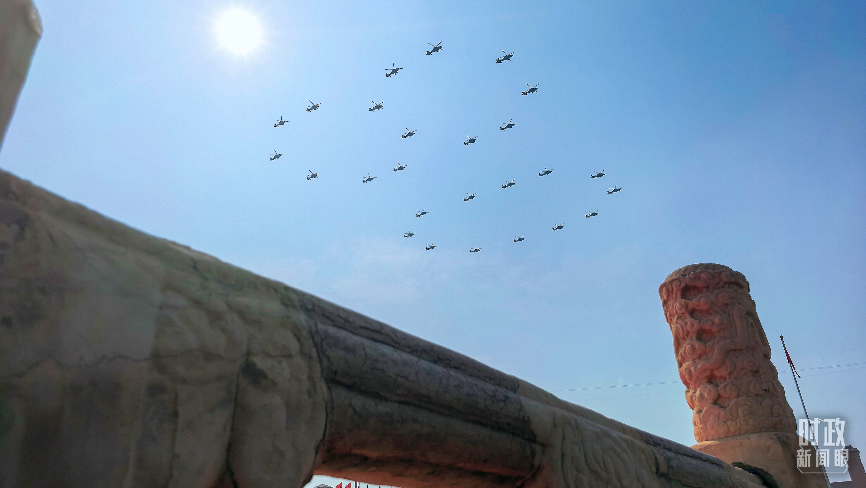 空中護(hù)旗梯隊率先亮相分列式環(huán)節(jié),26架直升機(jī)組成巨大的“80”字樣。教練機(jī)梯隊拉出14道彩煙,向中華民族14年可歌可泣的抗戰(zhàn)歷程致敬,向14億多中國人民奔向強國復(fù)興的不懈奮斗致敬。