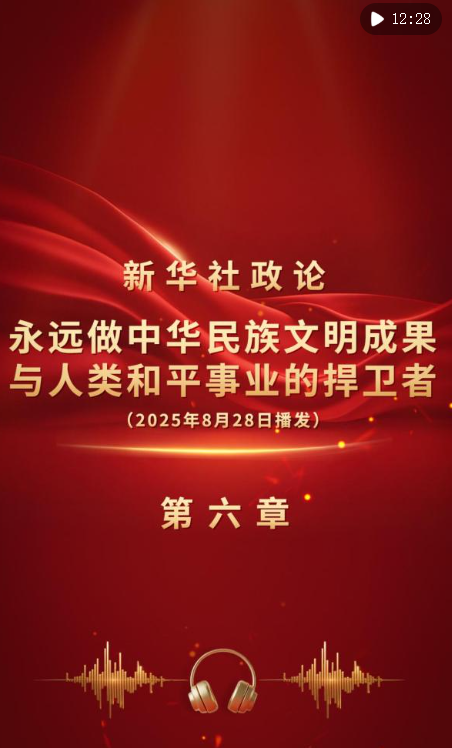 新華社8月28日播發(fā)《新華社政論|永遠做中華民族文明成果與人類和平事業(yè)的捍衛(wèi)者——寫在中國人民抗日戰(zhàn)爭暨世界反法西斯戰(zhàn)爭勝利80周年之際》。我們邀請誦讀嘉賓劉勁演播“第六章”。