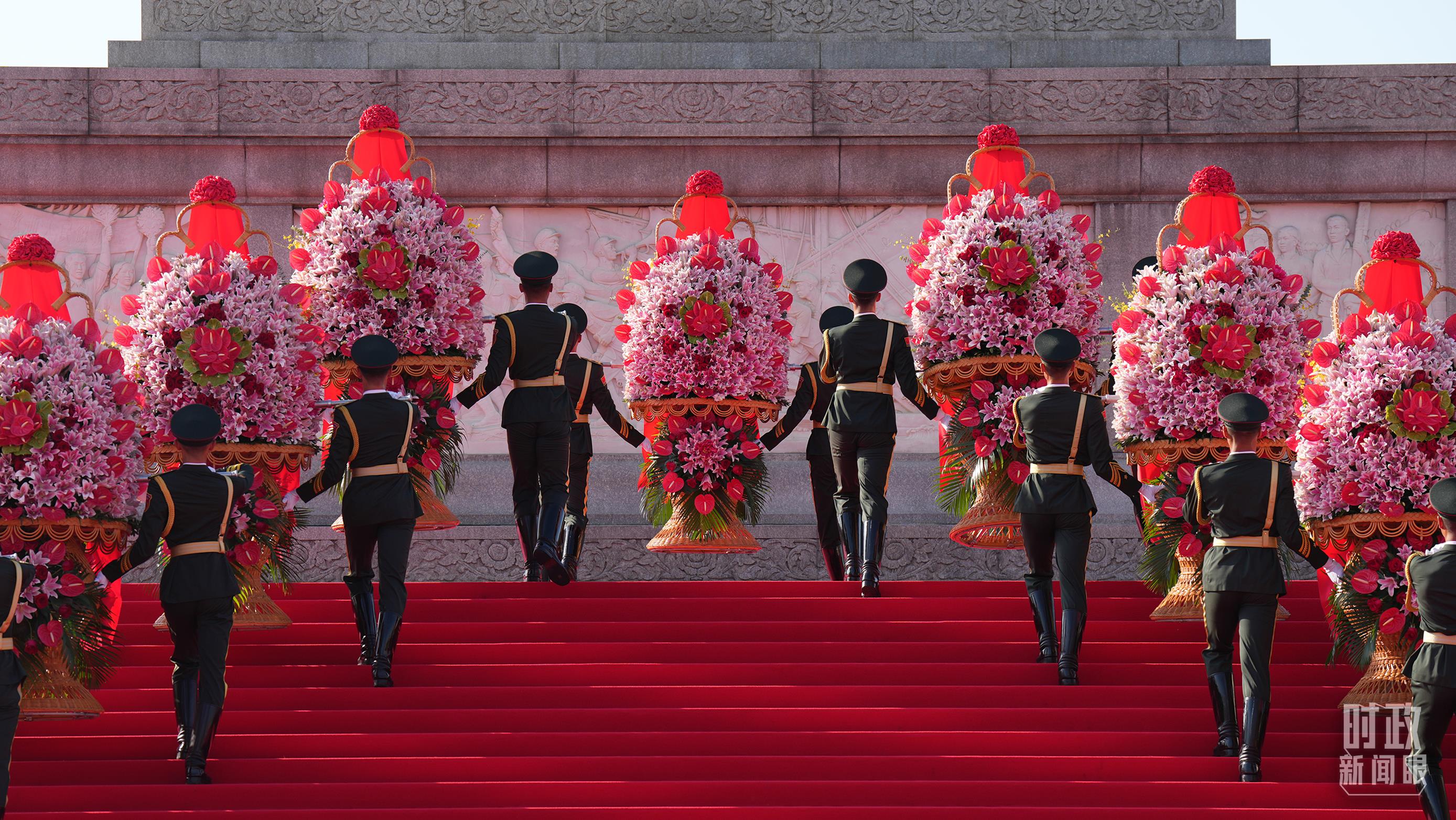 18名禮兵穩(wěn)穩(wěn)抬起花籃,緩步走向人民英雄紀念碑,將花籃擺放在紀念碑基座上。