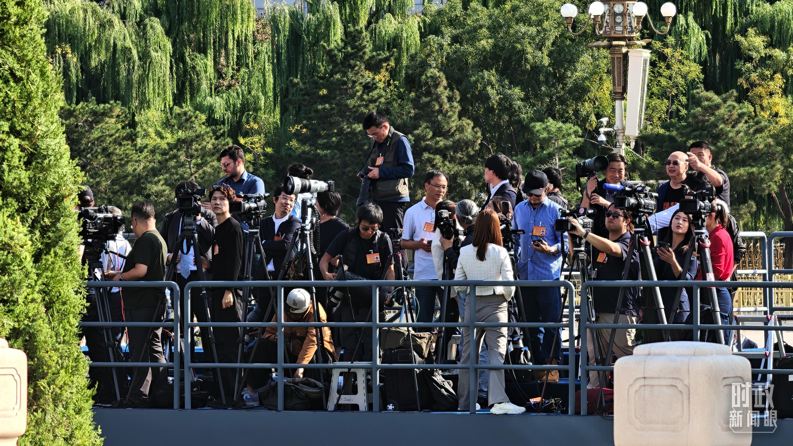 9月30日,天安門廣場上現(xiàn)場報道的記者。(總臺央視記者鄂介甫拍攝)