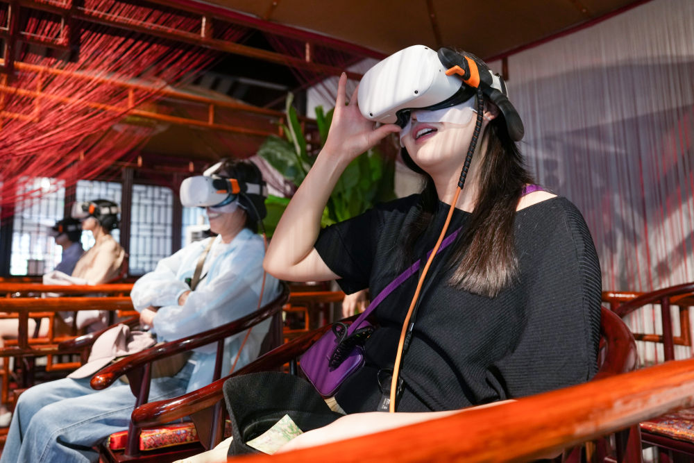 2025年5月18日,游客在江蘇蘇州拙政園體驗VR漫游。近年來,蘇州不斷推進“數(shù)字園林”建設(shè),在園林整體數(shù)字建模、園林要素數(shù)據(jù)庫建設(shè)等方面開展探索,利用數(shù)字技術(shù)創(chuàng)造“數(shù)字云游”VR場景,打造“云游拙政園”“獅林園宇宙”“留園虛擬元宇宙”等項目,營造真實可感的虛擬空間,讓觀眾沉浸式感受蘇州園林的獨特魅力。