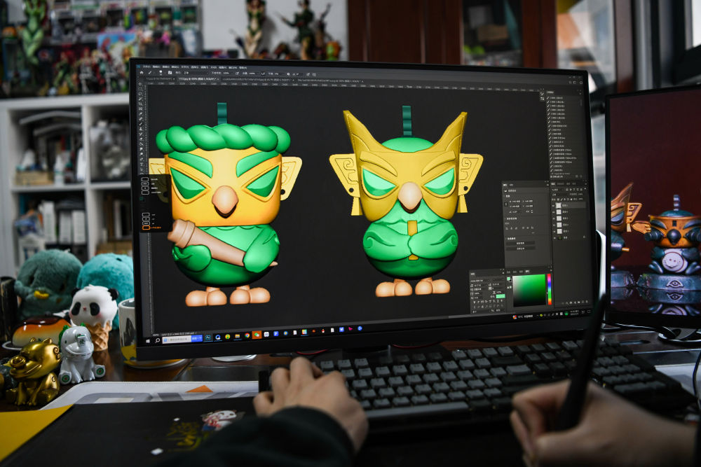 2025年3月1日,文創(chuàng)產(chǎn)品策劃運營師曾舟在位于四川成都的辦公室內(nèi)完善文創(chuàng)產(chǎn)品細節(jié)。他以三星堆青銅神樹、青銅縱目面具、青銅獸面等文物為創(chuàng)作藍本,結(jié)合潮玩元素設(shè)計的文創(chuàng)作品廣受歡迎?!拔蚁胱龅牟皇峭婢呖煜罚怯袃?nèi)容、有溫度、有意義的文化IP,讓年輕一代隨手摸到沉淀千年的文化?!痹壅f。