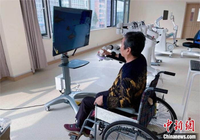 寧陽縣醫(yī)養(yǎng)服務(wù)中心內(nèi),老人在借助智能化設(shè)備做康復(fù)訓(xùn)練。寧陽縣委宣傳部供圖