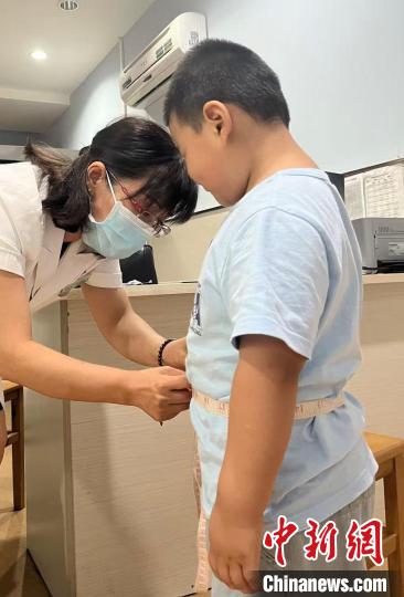 圖為西安市兒童醫(yī)院營(yíng)養(yǎng)科主任醫(yī)師劉瑞萍(左)測(cè)量?jī)和眢w數(shù)據(jù)。(受訪(fǎng)者供圖)