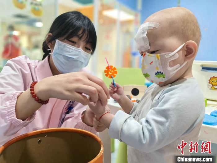 4月15日,湖南省兒童醫(yī)院血液腫瘤科新陽(yáng)光病房學(xué)校內(nèi),17歲的實(shí)習(xí)護(hù)士小雯(化名)正在和白血病患兒做手工。她說(shuō),看著他們仿佛就看到了從前的自己,想做“執(zhí)炬人”,為病痛中的孩子傳遞希望。