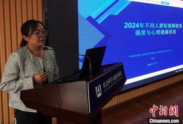 發(fā)布會(huì)上,中國科學(xué)院心理研究所助理研究員郭菲解讀“2024年不同人群短視頻使用強(qiáng)度與心理健康狀況”調(diào)查報(bào)告。中新網(wǎng)記者 孫自法 攝