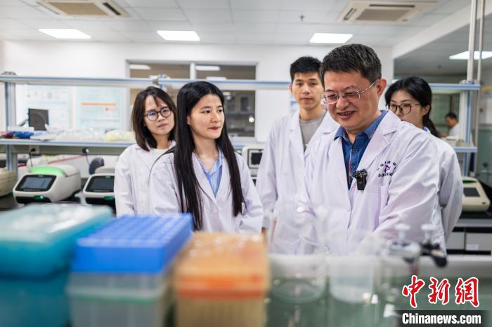 5日,廈門大學(xué)公共衛(wèi)生學(xué)院院長(zhǎng)張軍(左四)與研發(fā)團(tuán)隊(duì)交流?!≈行戮W(wǎng)記者 李思源 攝
