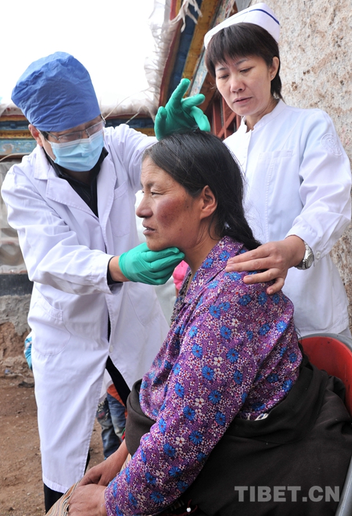 這是曾為斯求卓瑪進(jìn)行手術(shù)的北京口腔醫(yī)院頭頸腫瘤科主任韓正學(xué)(左)到藏北上門為斯求卓瑪做術(shù)后檢查。(唐召明2015年7月14日攝)
