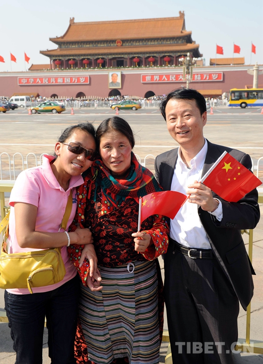 這是斯求卓瑪(中)和藏醫(yī)兼翻譯的旦增達(dá)色(左),以及一直幫助她的中石化首批援藏干部李一超(右)一起在北京天安門廣場(chǎng)合影留念。(唐召明2010年5月1日攝)