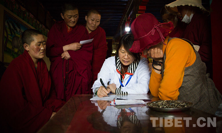 2019年5月,“同心·共鑄中國心” 醫(yī)療志愿者在拉薩市羊八井鎮(zhèn)的嘎洛寺,為寺內(nèi)尼眾進行義診。攝影:趙耀
