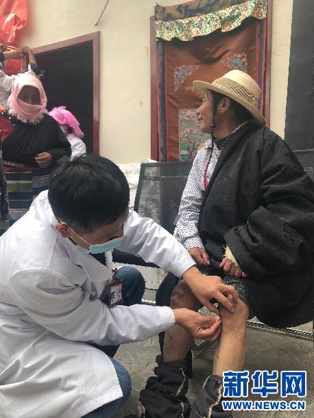 援藏醫(yī)生為貢布云旦針灸治腿 新華網(wǎng)發(fā) (王宇翀攝)