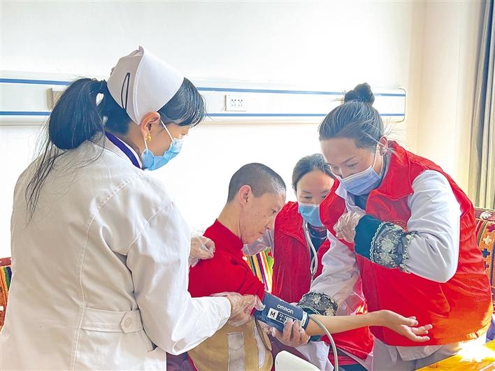 圖為志愿者們協(xié)助醫(yī)生,給那曲市殘疾人聯(lián)合會殘疾人康復托養(yǎng)中心的患者測量血壓。記者 萬靖 攝