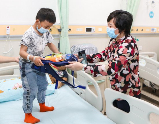 鄧?yán)蚋敝魅我恍锌赐藖?lái)渝治療的15位患兒,并為他們送上嶄新的書(shū)包和文具。并與患兒家長(zhǎng)熱情交談,詳細(xì)了解患兒恢復(fù)情況?;純杭覍俅碜楷敽屯贩謩e向重慶市衛(wèi)健委和重醫(yī)附屬兒童醫(yī)院贈(zèng)送了錦旗,并獻(xiàn)上了潔白的哈達(dá)表示感謝。