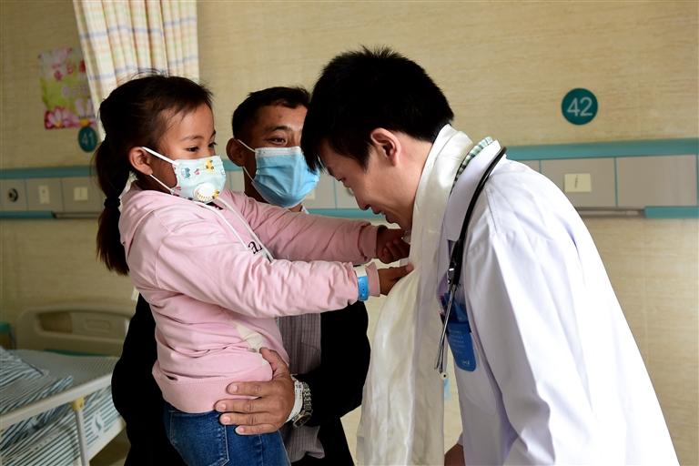 患兒(左一)在家長陪同下向主治醫(yī)師車轟獻哈達表示感謝。黃博涵 攝