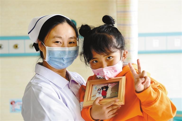 患兒(右)在出院前和護士長馬寒香合影。黃博涵 攝