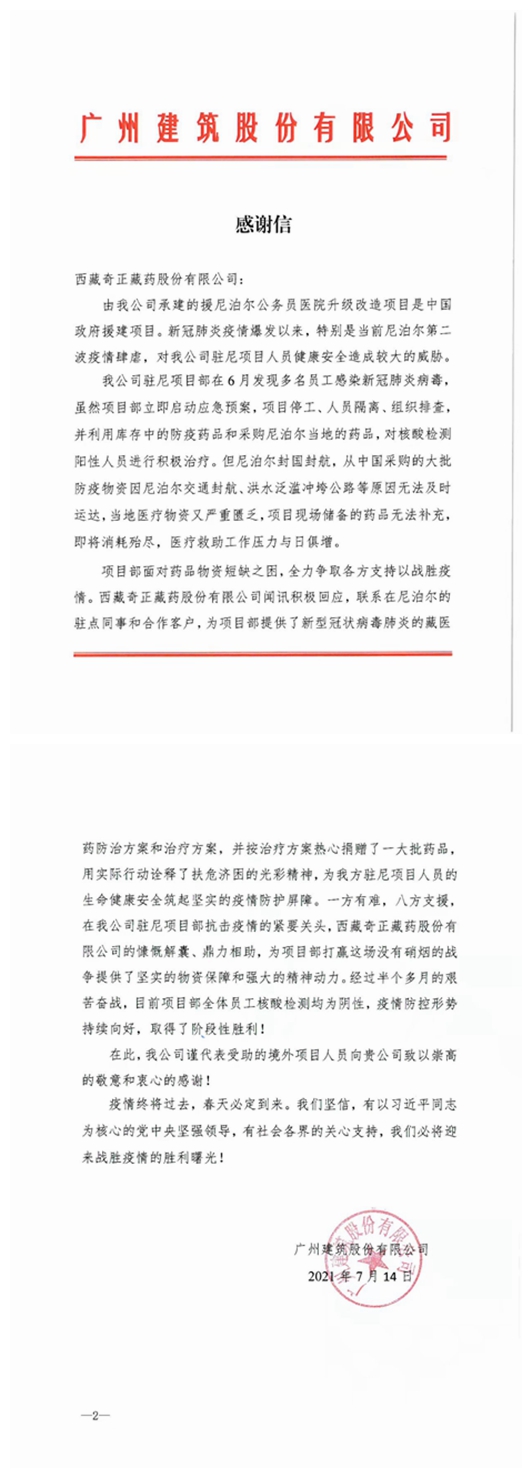患者經(jīng)多次核酸檢測(cè)轉(zhuǎn)陰未復(fù)陽后,廣州建筑集團(tuán)特地給西藏奇正藏藥股份有限公司寫了一份感謝信,信中寫到:西藏奇正藏藥股份有限公司為項(xiàng)目部提供了新型冠狀病毒肺炎的藏醫(yī)藥防治方案和治療方案,并按治療方案熱心捐贈(zèng)了一大批藥品,用實(shí)際行動(dòng)詮釋了扶危濟(jì)困的光彩精神,為我方駐尼項(xiàng)目人員的生命健康安全筑起堅(jiān)實(shí)的疫情防護(hù)屏障。一方有難,八方支援,在我公司駐尼項(xiàng)目部抗擊疫情的緊要關(guān)頭,西藏奇正藏藥股份有限公司的慷慨解囊、鼎力相助,為項(xiàng)目部打贏這場(chǎng)沒有硝煙的戰(zhàn)爭(zhēng)提供了堅(jiān)實(shí)的物資保障和強(qiáng)大的精神動(dòng)力。
