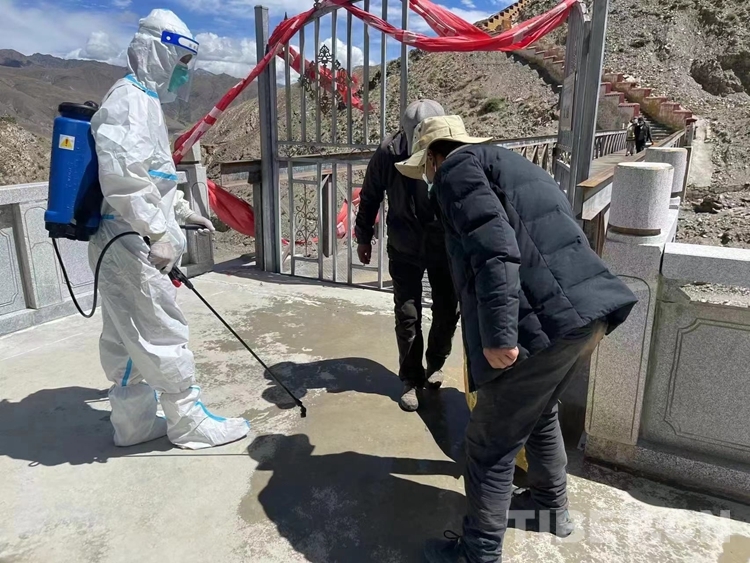 圖為瓊結(jié)縣藏醫(yī)院醫(yī)護人員在瓊結(jié)縣下水鄉(xiāng)唐布齊村做消殺工作