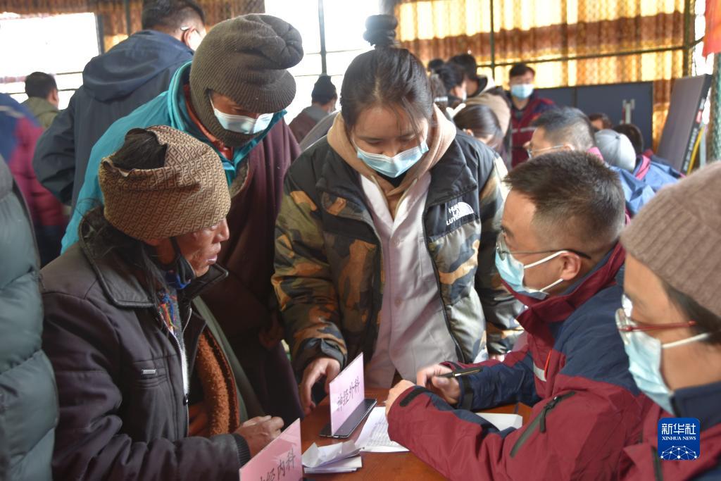 圖為自治區(qū)衛(wèi)生健康系統(tǒng)的志愿者在瓊結(jié)縣為群眾贈藥、解答健康問題。記者 劉楓 攝