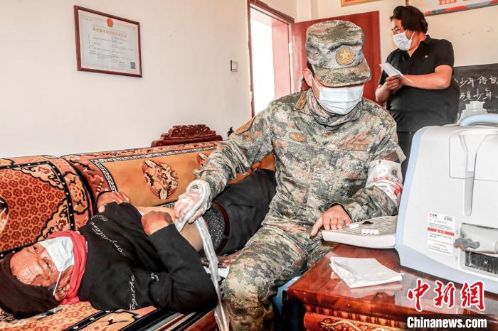 圖為醫(yī)療隊(duì)軍醫(yī)來(lái)到格桑措姆老人的家中為她檢查膝蓋疼痛問(wèn)題?!≈煳男?攝
