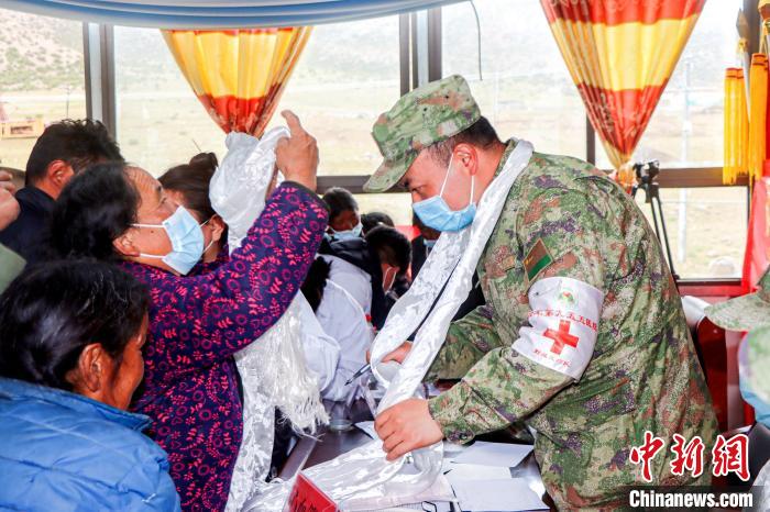圖為村民紛紛為醫(yī)療隊(duì)軍醫(yī)敬獻(xiàn)哈達(dá)?!≈煳男?攝