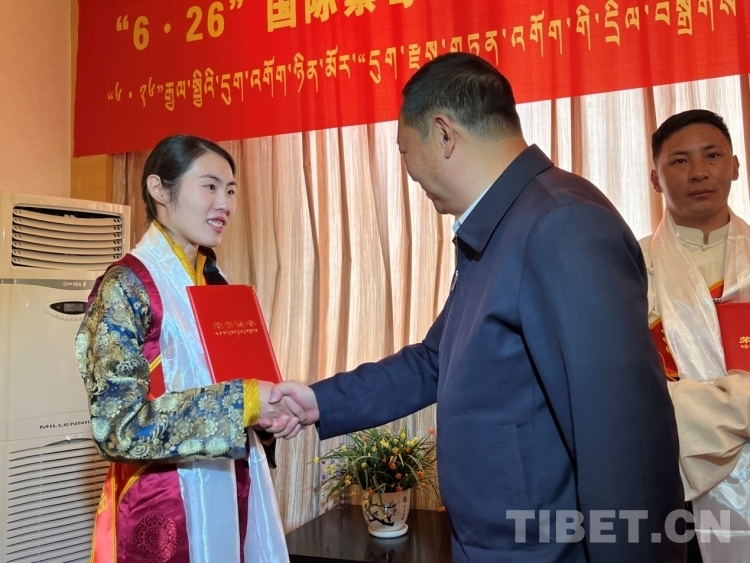 圖為相關(guān)領(lǐng)導(dǎo)為西藏禁毒達人頒發(fā)榮譽證書 攝影:德吉卓瑪