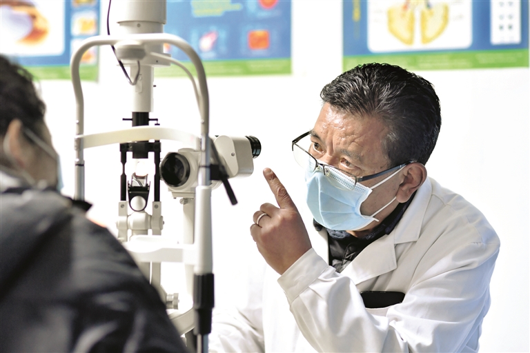 圖為3月24日,西藏拉薩光明眼科康復(fù)診療院醫(yī)生對(duì)白內(nèi)障患者進(jìn)行檢查。記者 覺(jué)果 攝