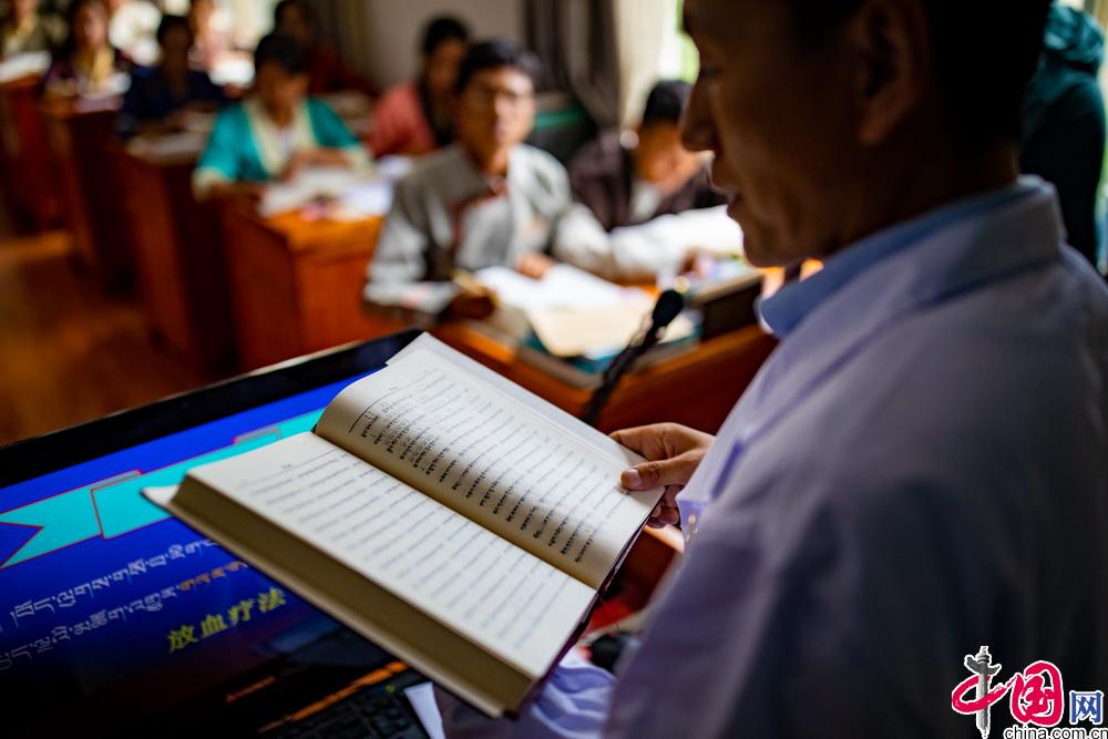 西藏藏醫(yī)藥大學(xué)開設(shè)特色鮮明的藏醫(yī)藥學(xué)唐卡教學(xué)課程?,F(xiàn)有醫(yī)學(xué)唐卡由十七世紀(jì)藏醫(yī)藥大家第司.桑杰嘉措創(chuàng)建,距今已有300多年的歷史。醫(yī)學(xué)唐卡用歸納、總結(jié)的方式將藏醫(yī)藥典籍《四部醫(yī)典》的主要內(nèi)容以“樹喻”方式繪示出來。成書于1300多年的《四部醫(yī)典》是藏醫(yī)藥學(xué)理論的根本大典。包括總則醫(yī)典、論述醫(yī)典、秘訣醫(yī)典和后續(xù)醫(yī)典。內(nèi)容涵蓋藏醫(yī)生理學(xué)、病理學(xué)、診斷學(xué)、治療學(xué)等基礎(chǔ)理論,細(xì)化了婦科、兒科、內(nèi)科、外傷等學(xué)科,包含了解剖學(xué)、護(hù)理學(xué)、藥學(xué)等眾多學(xué)科。圖為學(xué)校老師在對醫(yī)學(xué)唐卡進(jìn)行講解。中國網(wǎng)記者 鄭亮攝