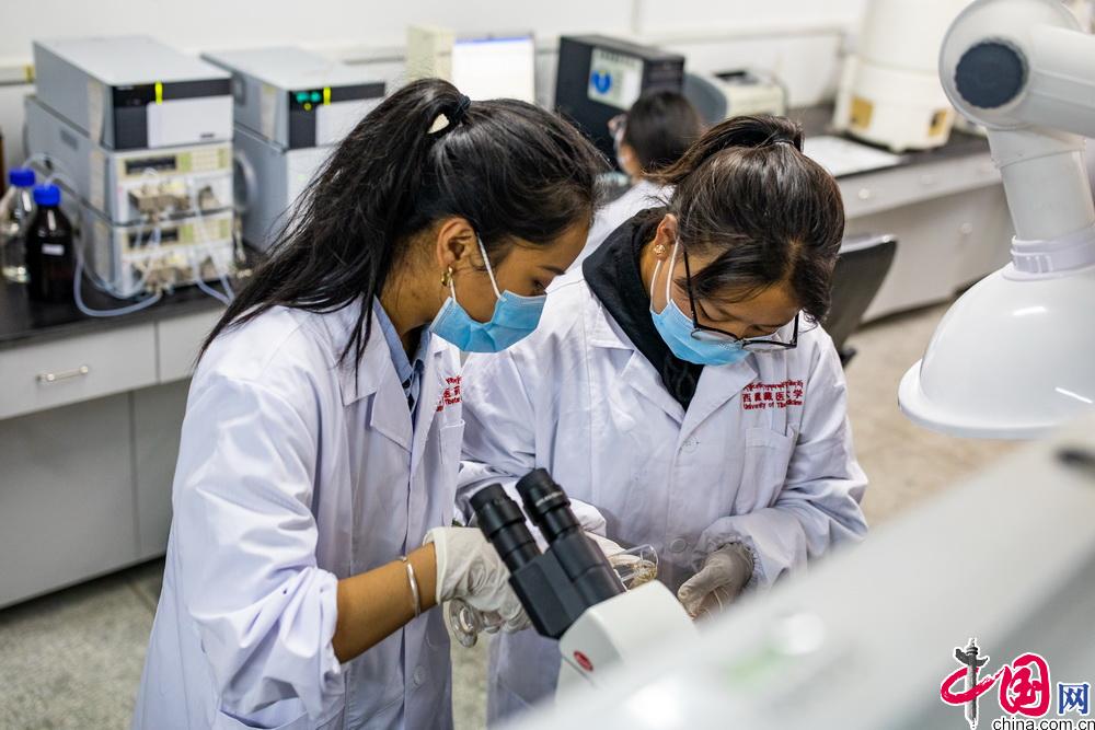 西藏藏醫(yī)藥大學(xué)目前擁有校內(nèi)實訓(xùn)室24個、附屬醫(yī)院1家,校外藏藥采認(rèn)藥實踐實訓(xùn)基地2個、非直屬附屬醫(yī)院2家、教學(xué)醫(yī)院7家、實習(xí)醫(yī)院11家、教學(xué)藥廠2家、實習(xí)藥廠1家,同時還擁有國家中醫(yī)藥管理局藏醫(yī)藥繼續(xù)教育培訓(xùn)基地、中醫(yī)藥優(yōu)勢特色教育(藏藥)培訓(xùn)基地和中央與地方共建藏醫(yī)特色療法實踐基地等重要教學(xué)基地。圖為學(xué)校學(xué)生在實驗室中進(jìn)行藥物試驗。中國網(wǎng)記者 鄭亮攝