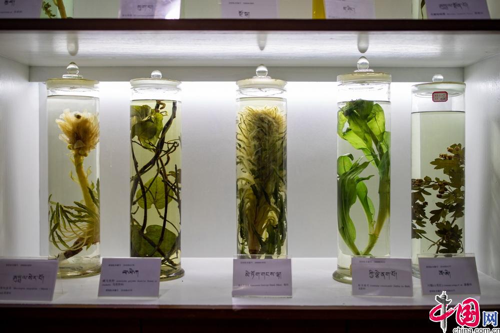 學(xué)校目前在藏藥新藥研發(fā)方面正在進(jìn)行“四臣止咳液”、“降糖靈”、“清血康”等藏藥的研發(fā),同時研發(fā)出了藏藥牙膏、藏藥面膜等延伸產(chǎn)品。在藥材種植方面,積極開展了瀕危藏藥材的種植攻關(guān)工作,先后對喜馬拉雅紫茉莉、 船形烏頭、紅景天等瀕危藏藥通過項目進(jìn)行育苗、種植等。圖為西藏藏醫(yī)藥大學(xué)內(nèi)所陳列的藏藥標(biāo)本。中國網(wǎng)記者 鄭亮攝
