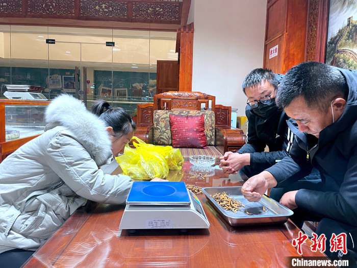 圖為商家為客戶挑選冬蟲夏草。中新社記者 孫睿 攝