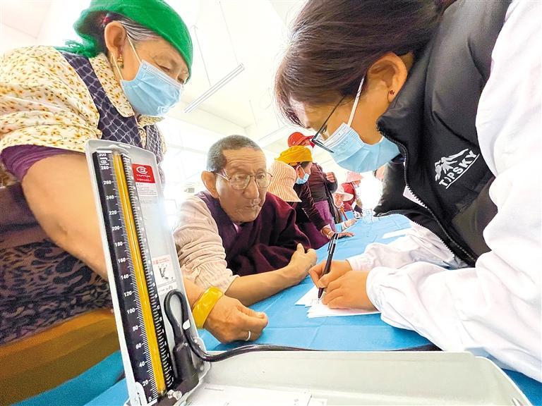圖為義診活動(dòng)中,醫(yī)護(hù)人員為群眾測(cè)量血壓。記者 次旺 攝